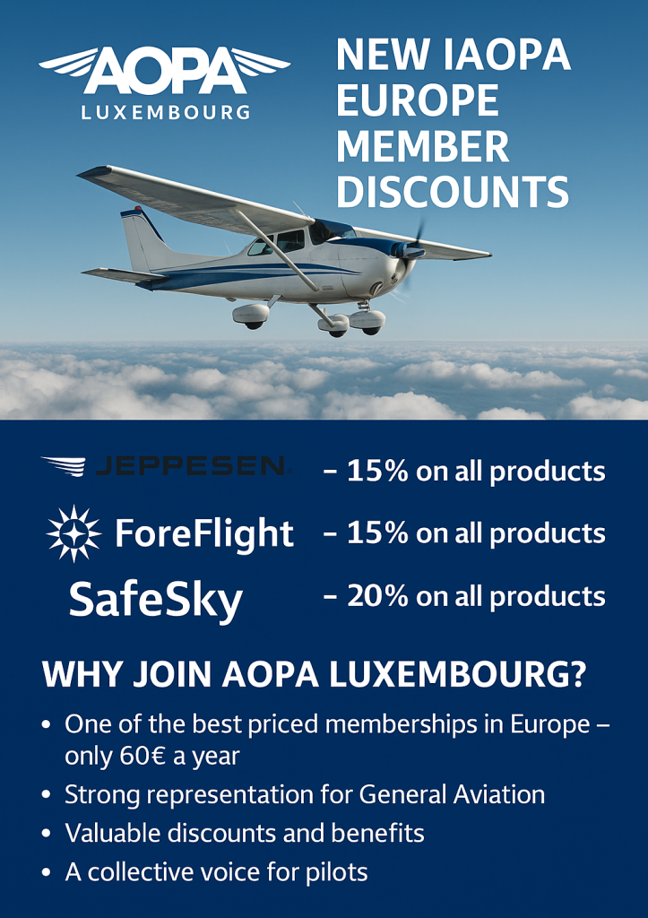 IAOPA Europe has recently negotiated several new pan-European discount agreements on behalf of member associations. I’m happy to confirm that these benefits are now available to AOPA Luxembourg members, as our membership list has been updated and synced with IAOPA.